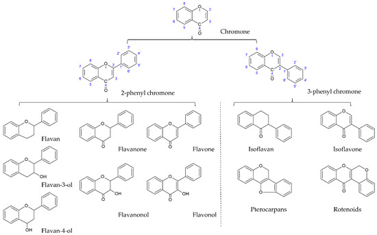 Plant secondary metabolites (natural products) are produced by the plant cells in plant–environment interactions through some metabolic pathways derived from the primary metabolic pathways. As the products of plant–environment interactions, some plant secondary metabolites function as phytoalexins or phytoantibiotics to protect plants from pathogens. Later on, researchers found that they had antibacterial, antifungal, and antiviral activities in humans. Scientists have continuously pointed out that plant secondary metabolites play important roles in plant physiology, plant pathology, human nutrition, and medicine. Plant secondary metabolites are represented by a variety of low molecular weight organic compounds. According to their structure, plant secondary metabolites are classified into several classes, such as terpenoids, glycosides, phenolics, and alkaloids [28,29]. Flavonoids are the largest and most studied subclass of the phenolics class among many plant secondary metabolites. According to the characteristics of chemical structure, flavonoids can be divided into two main groups: the flavonoids group (mainly including flavanones, flavanonols, flavones, flavonols, flavan-3-ols, flavan-4-ols, and anthocyanidins) and the isoflavonoids group (mainly including isoflavones, isoflavans, pterocarpans, and rotenoids). The structure of flavonoids comprises the 2-phenylchroman skeleton, which is a linear C6-C3-C6 skeleton derived from a phenylpropanoid (C6-C3) starter and three C2 elongation units. However, the structure of the isoflavonoids group comprises the 3-phenylchroman skeleton, which is derived from the 2-phenylchroman skeleton via an aryl migration reaction (Figure 1) [30]. Isoflavonoids have been widely studied and have attracted substantial attention in fields ranging from chemotaxonomy and plant physiology to human nutrition and medicine. In chemotaxonomy, isoflavonoids are recognized as chemosystematic markers due to their presence and distribution in different plants. In general, isoflavonoids are mostly found in legumes (Fabaceae family), such as Astragalus spp., Dalbergia odorifera T. C. Chen, Glycyrrhiza spp. (Licorice), Glycine max (L.) Merr. (soybean), Hedysarum multijugum Maxim, Iris spp., Lupinus spp., Medicago spp. (barrel medic), Pueraria montana var. lobata (Lour.) Merr., Sophora flavescens Aiton, and Trifolium spp. (clover). Occasionally, isoflavonoids can be found in 31 non-leguminous families, such as Asteraceae, Chenopodiaceae, Iridaceae, Moraceae, Myristicaceae, and Nyctaginaceae [31,32,33,34,35]. In plant physiology, isoflavonoids are considered as phytoalexins or phytoantiobiotics due to their antifungal and insecticidal properties. In human nutrition and medicine, isoflavonoids are known as phytoestrogens due to their structural similarity with 17-β-estradiol. So far, approximately 1600 isoflavonoids have been identified, seven subclasses (isoflavones, isoflavans, isoflavanones, isoflavanols, pterocarpans, coumestans, and rotenoids) are mainly mentioned, which are generated through the biosynthetic modification of core (general or central) phenylpropanoid pathways and downstream flavonoid/isoflavonoid branch pathways. In general, isoflavones are the most important and largest subgroup of isoflavonoids, and they often serve as precursors of other isoflavonoid phytoalexins such as isoflavans, pterocarpans, rotenoids, and coumestans due to their core isoflavonoid scaffold. According to the difference in the substitutions and the position of substitutions on the basic structural skeleton, isoflavones are often divided into three subgroups: simple O-substituted derivatives (i.e., hydroxy, methoxy, methylenedioxy, etc.), prenylated derivatives (i.e., prenyl, isoprenyl, etc.), and glycosides [31,32,33,34,35]. Among these three subgroups of isoflavones, simple O-substituted isoflavones such as daidzein, genistein, glycitein, biochanin A, and formononetin are the most common ingredients in the legumes used as daily dietary supplements. The glycosides of simple O-substituted isoflavones (daidzin, genistin, glycitin, ononin, and astroside) are more abundant than these aglycones in the legumes. Due to their structural similarity with 17-β-estradiol, these above isoflavones (simple O-substituted isoflavones, as well as their glycosides and metabolites) are considered to possess estrogen-like properties via binding to estrogen receptors (ERs), leading to the activation of estrogen-related receptor response elements (ERRE) located on the inner side of the nuclear membrane, and, in turn. promoting gene transcription processes. However, simple O-substituted isoflavones usually possess a higher affinity for ERs than their glycosides. As for the affinity of their metabolites for ERs, there is a large degree of variability. For example, the affinity of equol for ERs is greater than that of its parent isoflavone-daidzein, and almost equivalent to that of genistein. However, O-desmethylangolensin (O-DMA) has a weaker affinity for ERs almost equivalent to its parent isoflavone-daidzein. Hence, these simple O-substituted isoflavones and some metabolites are recognized as phytoestrogens for use as dietary estrogen supplements in alternative hormone replacement therapy [36,37,38,39]. Many researchers have studied the various pharmacological activities of these novel simple O-substituted isoflavones (daidzein, genistein, glycitein, formononetin, and biochanin A), their glycosides (including daidzin, genistin, glycitin, ononin, and astroside), and their metabolites (equol and O-DMA). These novel simple O-substituted isoflavones, as well as their glycosides and metabolites, possess many pharmacological activities similar to estrogen, including antioxidant, anti-inflammatory, anticancer, anti-angiogenetic, hepatoprotective, antidiabetic, antilipidemic, anti-osteoporotic, and neuroprotective activities. Some review studies on versatile pharmacological potential, anticancer, antidiabet