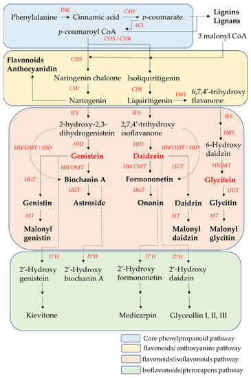 The biosynthesis pathway and related enzymes of isoflavones have been investigated extensively using biochemical and genetic methods. Nearly all enzymes in isoflavone biosynthesis have been isolated, and their structure and functional characterization are understood. Isoflavonoids are synthesized through the core phenylpropanoid pathway and downstream flavonoids/isoflavonoids biosynthetic branch pathway (Figure 3) [59,60].