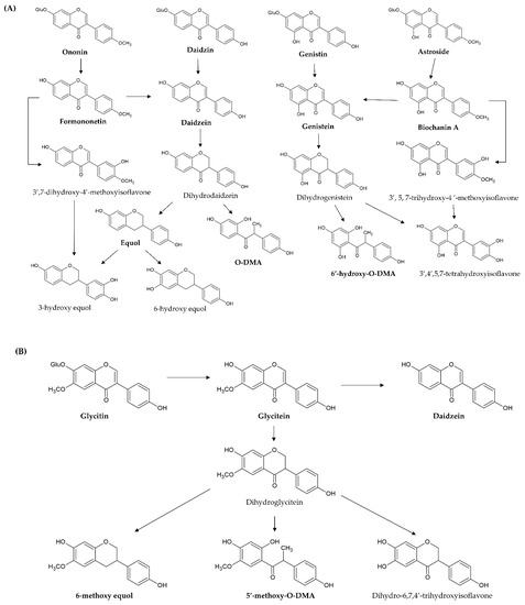 As for glycitein, only a small amount is converted to daidzein through demethoxylation because the proximity of the 6-methoxyl and the 7-hydroxyl groups blocks the demethoxylation. It is predominately reduced to dihydroglycitein, and then metabolized to 6-methoxy equol, 5′-methoxyl-O-DMA, and dihydro-6,7,4′-trihydroxyisoflavone by liver cytochrome P450 isoforms [78] (Figure 4B).