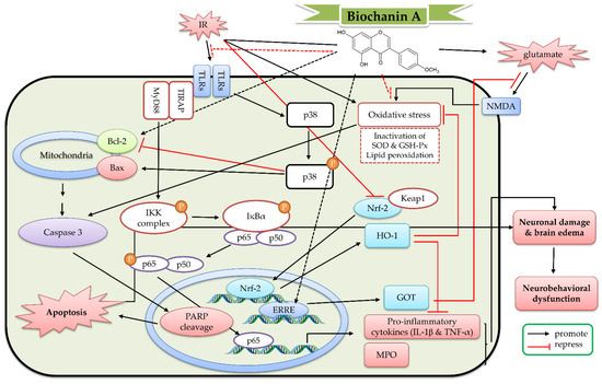 In a rat transient MCAO (occlusion for 2 h) model, biochanin A (10–40 mg/kg, intraperitoneal pretreatment for 14 days) decreased the infarct size and brain edema, as well as improved neurological deficit. Biochanin A suppressed the inflammatory processes (including increased MPO activities, cytokine levels, and mRNA expression). Biochanin A also decreased the lipid peroxidation and enhanced the activities of antioxidant enzymes (including SOD and GSH-Px). Furthermore, biochanin A suppressed the expression of C/EBP-homologous protein (CHOP), the phosphorylation of p38 and IκB, and NF-κB p65 translocation. However, biochanin A increased the expression of glucose regulated protein 78 (GRP78), the phosphorylation of HO-1, and Nrf-2 translocation [123,124,125]. In another transient MCAO experiment, biochanin A (5–10 mg/kg, intraperitoneal pretreatment for 4 weeks) attenuated stroke lesion volume and improved sensorimotor function. This protection was blocked by GOT knockdown [118]. In an experimental subarachnoid hemorrhage model, biochanin A (10–40 μg/μL, intracisternal injection at 1 h after the induction) attenuated brain edema and improved neurobehavioral dysfunction. Biochanin A further decreased microglial activation and cytokine levels via decreasing the expression of TLR2, TLR4, Toll-interleukin-1 receptor domain-containing adapter protein (TIRAP), and MyD88 protein. Biochanin A also decreased neuronal apoptosis via activating the Bcl-2 family [126]. Hence, biochanin A exerted protective effects against cerebral IR through inducing GOT gene expression, decreasing endoplasmic reticulum stress, activating the Bcl-2-regulated anti-apoptotic pathway and Nrf-2/HO-1 pathway, and inhibiting the TLRs/TIRAP/MyD88/NF-κB signaling pathway. On the basis of these studies, the detailed protective mechanism of biochanin A against cerebral IR is shown in Figure 7.