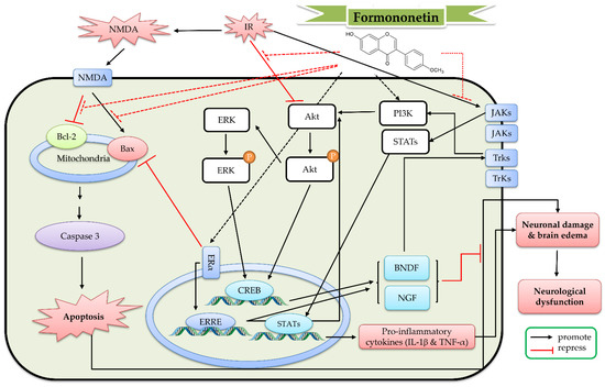 Formononetin (10 μM) decreased apoptotic neuronal death caused by NMDA (100 μM) in primary cortical neurons. Formononetin further increased the expression of Bcl-2 and pro-caspase-3, as well as decreased the expression of Bax and caspase-3 [129]. In a transient MCAO (occlusion for 2 h) model, formononetin (12.5–50 mg/kg, intraperitoneal pretreatment for 14 days) reduced the infarct size and brain edema. Formononetin improved the neurological deficit and increased the number of neuronal dendritic spines. Formononetin increased the mRNA and protein expression of ER-α and Bcl-2, as well as decreased the mRNA and protein expression of Bax. Formononetin further increased the phosphorylation of Akt, ERK, and Trk A and B, as well as the expression of nerve growth factor (NGF), BDNF, β tubulin-III, and GAP-43 [130,131]. In another transient MCAO experiment (occlusion for 60 min), formononetin (30 mg/kg) alleviated the cerebral infarction and the neurological deficit, as well as reduced the mRNA levels of IL-6 and IL-1β in rat brain tissue, the protein levels of NLRP3, ASC, cleaved caspase-1, and cleaved IL-1β, and the phosphorylation of Janus kinase 2 (JAK2) and STAT3 in the MCAO rat brain tissue [132]. Hence, the benefit mechanism of formononetin against cerebral IR might be related to the reduction in neuroinflammation via the JAK/STAT/inflammasome pathway, the decrease in neuronal apoptosis via the Bcl-2-regulated anti-apoptotic pathway and increase the neuronal differentiation and synaptic plasticity via the BDNF/Trk and PI3K/AKT/ERK pathways. On the basis of these studies, the detailed protective mechanism of formononetin against cerebral IR is shown in Figure 8.