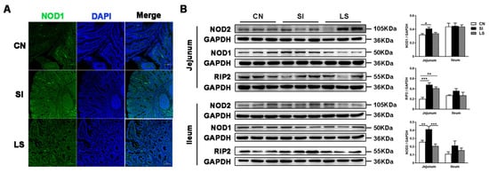 Activation of NOD1 and NOD2 by peptidoglycans induces and initiates autophagy, which is important in ER stress-induced inflammation. Immunofluorescence results showed that S. Infantis infection increased the number of NOD1-positive cells in the SI group but not in the LS group in the jejunum (Figure 1A). Western blotting analysis also showed that the protein levels of NOD1, NOD2, and its primary adapter protein RIP2 in the jejunum were higher in the SI group than in the CN group. However, NOD1/2 protein expression in the LS group showed no significant difference in comparison with the CN group (Figure 1B). The protein levels of NOD2, NOD1, and RIP2 in the ileum were not significantly changed (Figure 1B).