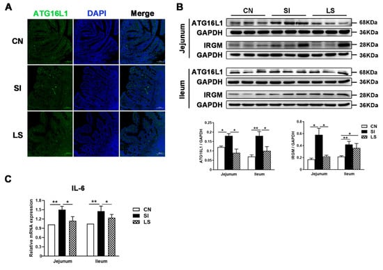 ATG16L1, an essential autophagy protein, plays a key role in bacterial clearance. Immunofluorescence results showed that S. Infantis infection increased the ATG16L1-positive staining area in jejunal mucosa, including lamina propria (Figure 2A). Consistently, Western blot results showed that the levels of autophagy-related proteins (ATG16L1 and IRGM) were significantly increased in the jejunum and ileum by S. Infantis. Pretreatment with L. johnsonii L531 could prevent the increased expression of ATG16L1 and IRGM induced by S. Infantis (Figure 2B).