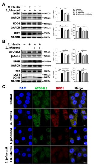 We further investigated the protein expression of NOD1, NOD2, downstream RIP2, as well as autophagy-related proteins in Caco2 cells after S. Infantis infection. Compared with the control group, S. Infantis elevated the expression of NOD1, NOD2, and RIP2 at 5 h post-infection. Pretreatment with L. johnsonii L531 for 3 h before the S. Infantis challenge effectively reversed these phenomena (Figure 3A).