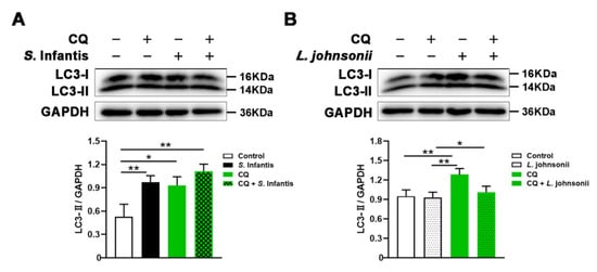 S. Infantis infection inhibits autophagy degradation of Caco2 cells, whereas L. johnsonii L531 accelerates this process. (A) Caco2 cells challenged with S. Infantis were pretreated with or without CQ. Western blotting analysis was conducted to detect the LC3 level. The lower panel shows the protein quantitation using Image J software. (B) Caco2 cells challenged with L. johnsonii L531 were pretreated with or without CQ. Western blotting analysis was conducted to detect the LC3 level. The lower panel shows the protein quantitation using Image J software. Data are represented as mean ± SEM, n = 3; * p < 0.05, ** p < 0.01, CQ, chloroquine.
