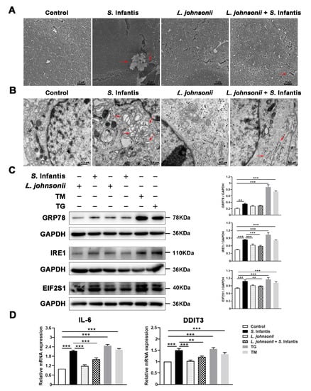 L. johnsonii L531 alleviates S. Infantis-induced ER stress and cellular ultrastructural damage in Caco2 cells. (A) Effect of L. johnsonii L531 on the structure of the ER in Caco2 cells after S. Infantis infection as observed using SEM. Red arrows indicate the damage caused by S. Infantis. (B) Effect of L. johnsonii L531 on the structure of apical surface in Caco2 cells after S. Infantis infection as observed using TEM. Red arrows indicate the damage caused by S. Infantis. (C) Western blotting analysis for GRP78, IRE1, and EIF2S1 in Caco2 cells. The right panels show the protein quantitation using Image J software. (D) Expression of Il6 and DDIT3 mRNA in Caco2 cells. Data are represented as mean ± SEM, n = 3, ** p < 0.01, *** p < 0.001.