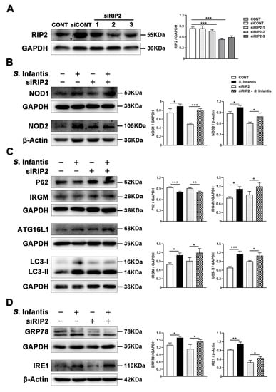 Silencing RIP2 could not block S. Infantis-induced autophagy and ER stress in Caco2 cells. (A) Western blotting analysis in Caco2 cells treated with siRNA-targeting RIP2. (B, C, and D) Western blotting analysis for NOD1, NOD2, P62, IRGM, ATG16L1, LC3, GRP78, and IRE1 in Caco2 cells. The right panels show the protein quantitation using Image J software. Data are represented as mean ± SEM, n = 3; * p < 0.05, ** p < 0.01, *** p < 0.001.
