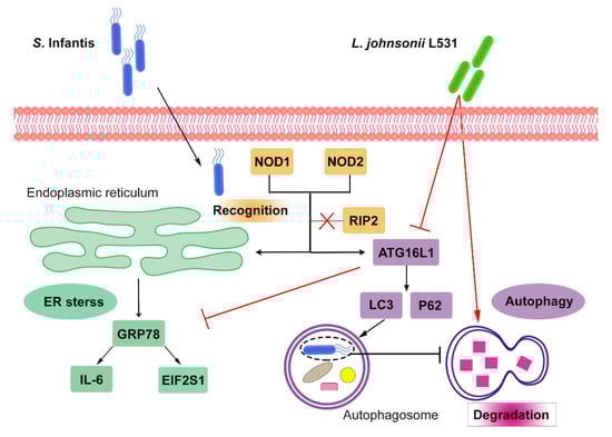 In this study, we demonstrate that L. johnsonii L531 pretreatment effectively ameliorates S. Infantis-induced NOD1/2 activation, ER stress, and autophagosome degradation, thereby contributing to alleviating intestinal tissue and cell damage. However, RIP2 is not dispensable during ER stress and autophagy induced by S. Infantis (Figure 7).
