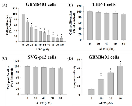 AITC decreased cell viability and induced cell apoptosis in GBM8401/luc2 cells. Cells (1 × 104 cells/well) were maintained in 96-well, and were treated with 0, 20, 30, 40, 50, 60, 70, 80, 90, and 100 μM of AITC for 48 h. After treatment, (A) GBM8401/luc2 cells, (B) THP-1, and (C) SVG-p12 cells were collected for measuring cell viability and (D) apoptosis of GBM8401/luc2 cells described in the Materials and Methods. (* Significantly different at p < 0.05 vs. the control group). Each treatment was replicated 3 times with 12 wells per group.