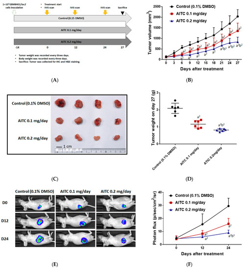 Eighteen 6-week-old nude mice (CAnN.Cg-Foxn1nu/CrlNarl mice) weighing 20–22 g were purchased from the National Laboratory Animal Center, Taipei, Taiwan. The experiment was approved by the Institutional Animal Care and Use Committee (IACUC) of China Medical University (ID number 2020-248). For each mouse, xenografts were inoculated into the right flank, comprising of 1 × 107 GBM8401/luc2 cells in 100 μL PBS with 30% Matrigel, and allowed to grow for 14 days. When the tumor reached 100–120 mm3, mice were separated into three groups (n = 6/per group). Control mice were treated daily with 0.1% DMSO in 100 μL phosphate-buffered saline (PBS) by gavage. Treatment groups were divided as 0.1 mg/day and 0.2 mg/day of AITC (in 100 μL of PBS) groups, with AITC administered by gavage. Mice were subjected to an IVIS scan on day 0, 12, and 24, and sacrificed on day 27 after treatment (Figure 3A). Mouse tumor and body weight were recorded every 3 days. Tumor volume was calculated following the formula V = length × width2 × 0.523 [59].