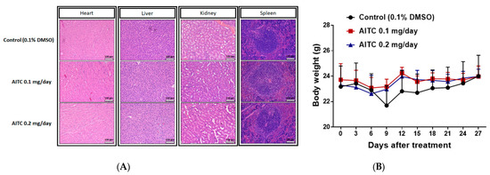 To investigate whether AITC treatment may induce tissue toxicity, we analyzed animal tissue pathology by H&E staining. As shown in Figure 4A, no apparent tissue pathology alteration, including heart, liver, kidney, and spleen tissues, was found in mice treated with 0.1 and 0.2 mg/day of AITC. The pathology was also interpreted by a veterinarian with pathological interpretation experience of more than 5 years. As illustrated in Table 1, extramedullary hematopoiesis with mildly increased megakaryocytes was noted in the liver and red pulp of the spleen in CT mice. However, these changes were minimal in 0.2 mg/day of AITC-treated mice. In addition, we also recorded the body weight of mice during the treatment period. In Figure 4B, no significant body weight changes were found in any of the groups of mice, indicating no apparent toxicity in AITC-treated groups.