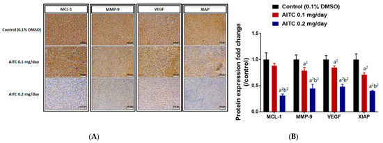 To identify the underlying mechanism of tumor growth inhibition, we further investigated the alteration of tumor-progression-related protein expression, including MCL-1, XIAP, MMP-9, and VEGF after AITC treatment by IHC staining of tumor tissues. As illustrated in Figure 5A,B, AITC effectively suppressed protein expressions of MCL-1, MMP-9, VEGF, and XIAP in the tumor area. The suppression percentage of theses oncogenes in ATIC 0.1 mg/day is around 20% as compared to control group. The suppression effect in ATIC 0.2 mg/day is around 40–60% as compared to control group. The positive staining results was found to be decreased by AITC in a dose-dependent manner.