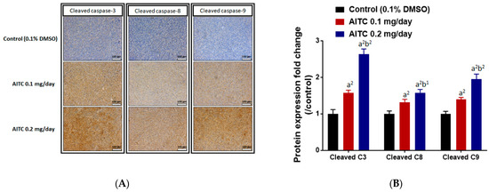AITC induced the expressions of apoptosis-related proteins. Tumors were isolated from each group and further examined by IHC staining. The IHC staining images of cleaved caspase-3, -8, and -9 on the mouse tumors were observed by microscope at 100 times magnification (A). The quantification data of cleaved caspase-3, -8, and -9 expressions are presented (B). (a2 p < 0.01 vs. control; b1 p < 0.05, b2 p < 0.01 vs. AITC 0.1 mg/day). Each section was imaged with 3 independent fields and quantified. (Scale bar = 100 μm, with 200× magnification).