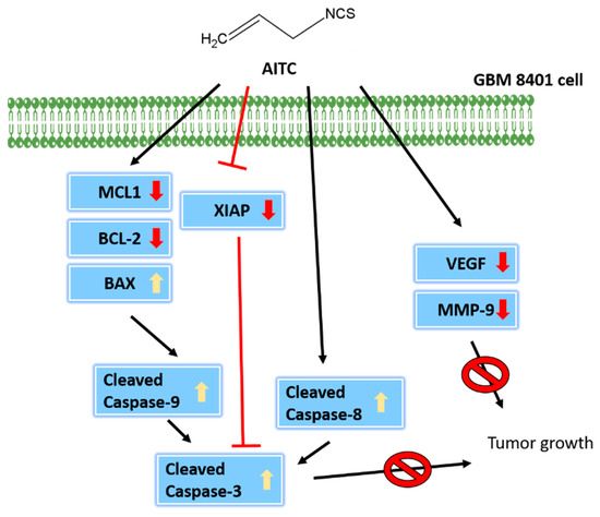 A tumor-inhibiting agent may show the potential to block multiple hallmark tumor capabilities [36], including triggering cell toxicity through the induction of cancer cell apoptosis without causing normal cellular toxicity. Simultaneously, it may alter protein expressions or block multiple cancer-associated pathways. Herein, to further confirm AITC activity involved in tumor growth retardation in GBM8401/luc2 cell xenograft mice, we used tumor samples from individual mice to investigate apoptosis-associated protein expression via an immunostaining assay on tumor sections. The results indicate that AITC decreased the levels of myeloid cell lymphoma-1 (MCL-1), matrix metalloproteinase-9 (MMP-9), vascular endothelial growth factor (VEGF), and X-linked inhibitor of apoptosis (XIAP) (Figure 5), and increased the expression of caspase-3, -8, and -9 in tumor sections (Figure 5). Moreover, these findings revealed that AITC significantly decreased the expression of anti-apoptotic proteins such as MCL-1 and XIAP compared to the control groups (p < 0.001). MCL-1, a unique component among anti-apoptotic Bcl-2 proteins, is an early response gene with rapid induction and turnover rates [37], and plays a unique and fundamental role in regulating apoptosis [38]. If the MCL-1 expression is inhibited, apoptosis induction could develop in certain malignancies [39,40]. XIAP prevents apoptosis through the direct inhibition of effector caspases (caspase-3, -6, -7, and -9) [41]. XIAP plays an anti-apoptotic function, and it also inhibits autophagy [42]. Thus, more attention has thus far been focused on XIAP suppression for developing new strategies to prevent and/or treat cancer [43]. Similar findings regarding the impact of AITC on other cancer cells in vivo from previous reports indicate that AITC inhibits the growth of human prostate cancer PC-3 cell xenografts in vivo via both inducing apoptosis and reducing mitotic activity [44].