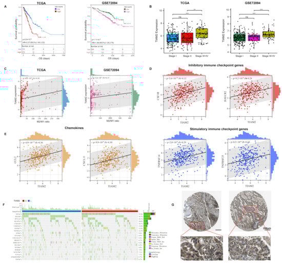 2.5. TIAM2 Correlated with Prognostic, Immunity, Mutational, and Pathological Changes in LUAD Patients