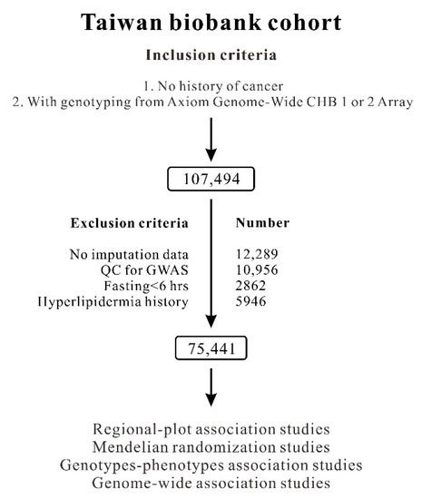 The TWB population-based cohort study recruited participants from centers across Taiwan between 2008 and 2020. A total of 107,494 participants who were genotyped using the Axiom Genome-Wide CHB 1 or 2 Array and had no history of cancer were enrolled. Of these participants, 32,053 were excluded from the analysis because 12,289 participants did not have imputation data; 10,956 participants exhibited second-degree relatedness, as indicated by an identity with descent PI_HAT of >0.187, which was determined from a QC analysis conducted in a GWAS; 2862 participants fasted for less than 6 h; and 5946 participants had a history of hyperlipidemia. Moreover, participants with a history of DM, hypertension, hyperlipidemia, or gout—as determined from an examination of glucose metabolism parameters, blood pressure status, lipid profiles, and serum uric acid levels, respectively—were excluded. Figure 1 illustrates the flowchart of participant enrollment. The definitions of DM, hypertension, hyperlipidemia, and current smoking status are provided in Supplementary Method S1. Ethical approval was received from the Research Ethics Committee of Taipei Tzu Chi Hospital, Buddhist Tzu Chi Medical Foundation (approval number: 08-XD-005), and Ethics and Governance Council of the Taiwan Biobank (approval number: TWBR10908-01). Each participant provided written informed consent.