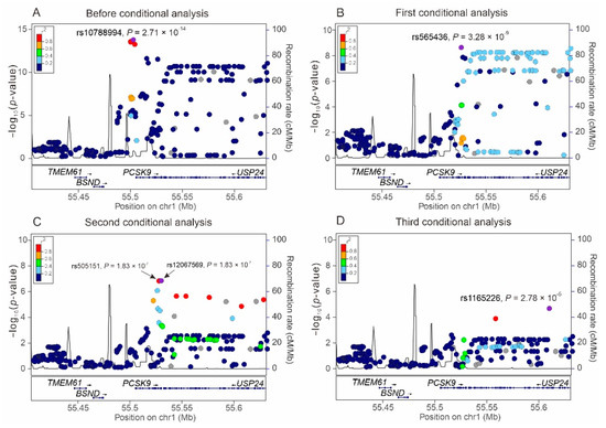 Regional association plots in a region of 200 kb surrounding the PCSK9 locus on chromosome 1p32 for low-density lipoprotein cholesterol levels. Regional plot associations are shown without (A) or with serial conditional analysis after further adjustment for rs10788994 (B), rs565436 (C), and rs505151 (D) genotypes.