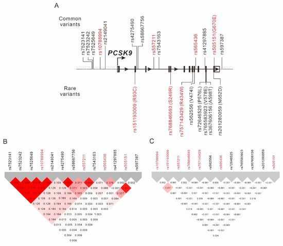 Location (A) and linkage disequilibrium (B,C) of common and rare PCSK9 variants. Shades of red and gray show the strength of the pairwise linkage disequilibrium based on r2, and numbers indicate the value of r2. Seven PCSK9 variants associated with LDL-C levels for weighted genetic risk scores are highlighted in red font.