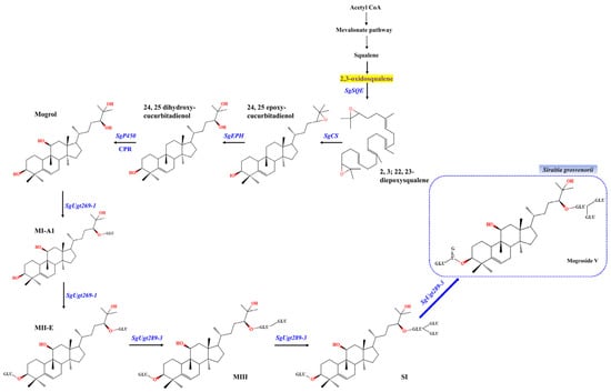 The Flow Chart of mogrosides biosynthetic pathway in Siraitia grosvenorii fruits. Mogrosides synthase genes which were transformed in this study are marked in blue, including SgSQE1, squalene epoxidases; SgCS, curbitadienol synthase; SgEPH2, epoxide hydrolases; SgP450, cytochrome P450 mono-oxygenase; SgUGT269-1 and SgUGT289-3, UDP-glucosyltransferases; The substrate, 2,3-oxidosqualene is shown with a yellow background. MI-A1, mogroside I-A1; MII-E, mogroside II-E; MIII, mogroside III; SI, siamenoside I; MV, mogroside V (in the dotted bordered rectangle).