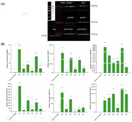 Total RNA was extracted from 0.1 g transgenic plant leaves using a CWBIO RNA extraction kit. The first-strand cDNA was s reverse transcribed from 1 μg of total RNA via HiScript Ⅲ 1st Strand cDNA Synthesis Kit (+gDNA wiper). The relative gene expression level of SgSQE1, SgCS, SgEPH2, SgP450, SgUGT269-1, and SgUGT289-3 were measured by real-time quantitative PCR (qRT-PCR) using Taq Pro Universal SYBR qPCR Master Mix. An ABI CFX96TM Real-Time System (Waltham, Massachusetts, USA) with the following reaction procedure: 95 °C for 30 s; 40 cycles of 95 °C for 3 s, 55 °C for 10 s. Nbactin (Accession number: XM_016619439) was internal control. This assay was conducted for multiple technical replicates. All the primers used for qRT-PCR are listed in Table S3.
