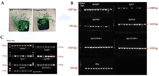 To assess the availability of Nicotiana benthamiana and Arabidopsis thaliana as plant chassis for mogrosides production, the U22p-SCE plasmid harboring mogrosides synthase genes were transformed into plants via Agrobacterium tumefaciens (Supplementary Materials, Figure S4). Sixteen Hyg-resistant tobacco transgenic lines were obtained. The sequences of the SgSQE1, SgCS, SgEPH2, SgP450, SgUGT269-1, SgUGT289-3, and Hyg genes were isolated from transgenic plants (Figure 2A). All the mogrosides biosynthesis-related genes were detected in six (N16, N22, N30, N32, N45, and N47) out of sixteen transgenic tobacco lines via PCR, which demonstrated that all target genes in the multigene vector were integrated into the tobacco genome. Then, the expression levels of target genes were measured by qPCR. All the target genes were overexpressed in the transgenic tobacco lines; however, no target genes were detected in the WT plants (Figure 2B). These data showed that the mogrosides biosynthesis-related genes were successfully expressed in Nicotiana benthamiana. Likewise, to select and generate transgenic Arabidopsis thaliana lines containing mogrosides biosynthesis-related genes, Arabidopsis thaliana (Col-0) plants were subjected to the Agrobacterium-mediated floral dip method (Figure 3A). T0 seeds were selected on MS media including Hyg, and 11 independent transgenic lines were identified by using PCR-based detection (Figure 3B). Subsequently, 7 transgenic lines were selected for RT-PCR analysis (Figure 3C).