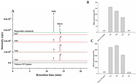 The quantitative analysis of mogrosides was performed as previously described with the HPLC-MS/MS method with minor modification []. Mogrosides were extracted from 4 g transgenic tobacco leaves and 5 g Arabidopsis leaves using 80% methanol by ultrasound extraction. The extraction conditions were as follows: 40 kHz frequency for 1 h at room temperature, and then centrifuged at 5000× g for 20 min. After, the collected supernatant was concentrated with nitrogen and diluted in 1 mL methanol.