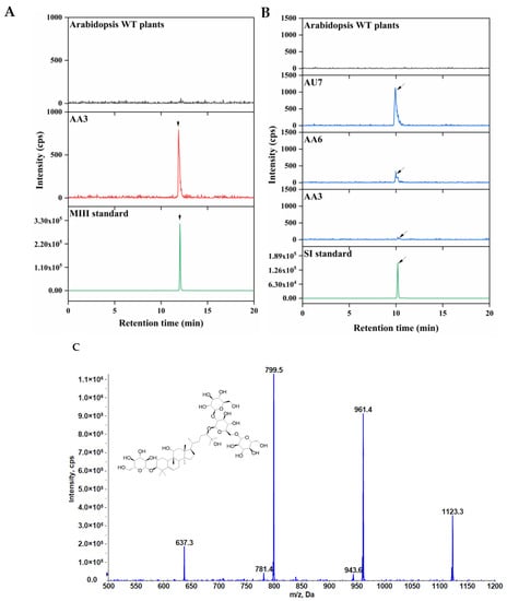 Production of mogrosides in transgenic Arabidopsis lines. (A) HPLC-MS/MS analysis of MIII in transgenic Arabidopsis lines. (B) HPLC-MS/MS analysis of SI in transgenic Arabidopsis lines. The black arrows indicate the peak of MIII and SI. (C) Full-scan product ion of SI.