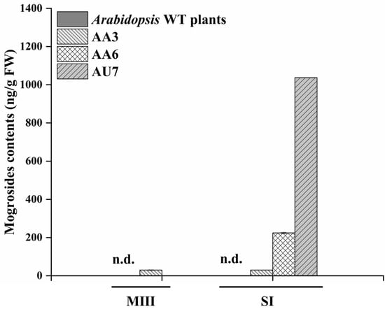 Accumulation of mogrosides in transgenic Arabidopsis lines AA3, AA6, and AU7. n.d., not detected. The data are presented as the mean values ± SDs, n = 3 biologically independent samples.