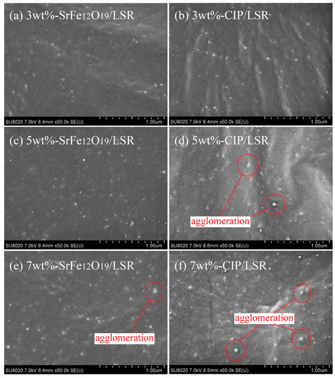 As illustrated by cross-sectional SEM images in Figure 1, the SrFe12O19/LSR and CIP/LSR nanocomposites show a highly uniform distribution with a high dispersivity but with different-sized nanofillers in LSR matrix. With the increase in filling content, the nanofiller size increases due to the pristine filler agglomerations, as especially manifested in 7 wt%-CIP/LSR nanocomposite. In contrast, the 7 wt%-SrFe12O19/LSR nanocomposite represents a preferable trend of mitigatory filler agglomeration with smaller filler sizes.