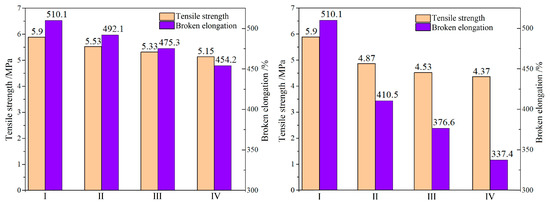 Tensile strength and broken elongation of SrFe12O19/LSR (left panel) and CIP/LSR (right panel) nanocomposites where I, II, III, and IV denote the filling contents of 0, 3, 5, and 7 wt%.