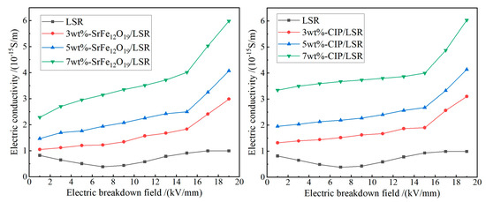Electric conductivities of both SrFe12O19/LSR and CIP/LSR nanocomposites are somewhat higher than that of LSR due to the filler-introduced electronic-states near band-edge in the bandgap of LSR which contribute charge carriers under thermal excitation at room temperature, as indicated by the profiles of electric conductivity versus electric field strength (γ-E curves) in Figure 3. The higher filling content leads to a higher electric conductivity for both SrFe12O19/LSR and CIP/LSR nanocomposites, such as 7 wt% filling content results in twice the conductivity of 3 wt% filling content, while the LSR conductivity remains nearly unchanged over the measured range of electric field strengths. Both SrFe12O19/LSR and CIP/LSR nanocomposites exhibit a linear γ-E curve under a low electric field, which however represents a significant nonlinearity under the electric field higher than 15 kV/mm, especially for the filling content higher than 5 wt%.