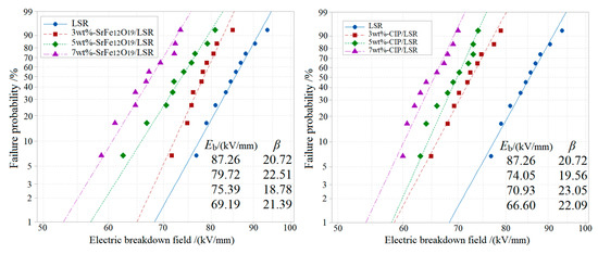The DC breakdown field strengths are analyzed by Weibull statistics, as shown in Figure 4, implying the lower dielectric-breakdown strength (as described by the characteristic breakdown field Eb) of both nanocomposites than that of LSR, which further abates with increasing filling content. Compared with LSR, the SrFe12O19/LSR nanocomposites with filling contents of 3, 5 and 7 wt% decline by 8.6%, 13.6% and 20.7% respectively in characteristic breakdown field, while CIP/LSR nanocomposites with these filling contents fall by larger magnitudes of 15.14%, 18.71% and 23.68% respectively. Since SrFe12O19 or CIP nanofillers introduce charge carriers and even cause percolation conductance under high electric fields and high filling contents, which is more evident for CIP nanofillers as shown by electric conductivity in Figure 3, the breakdown resistances of their nanocomposites are inevitably decreased in comparison with LSR. Therefore, the insulation persistence or degradation of LSR nanocomposites is highly reliant on the mixing compatibility of magnetic inorganic nanofillers with LSR matrix, as indicated by the appreciably higher insulation performances of SrFe12O19/LSR nanocomposites than that of CIP/LSR nanocomposites.