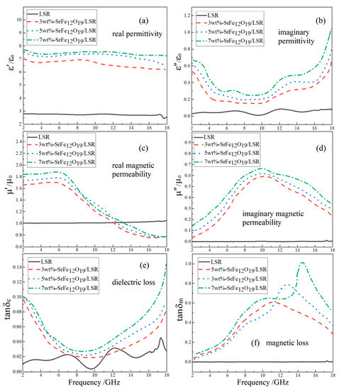 Electromagnetic-response frequency spectra of SrFe12O19/LSR nanocomposites: (a–d) complex dielectric permittivity and magnetic permeability; (e,f) dielectric and magnetic losses.