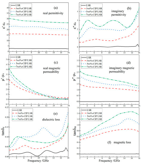 Electromagnetic-response frequency spectra of CIP/LSR nanocomposites: (a–d) complex dielectric permittivity and magnetic permeability; (e,f) dielectric and magnetic losses.