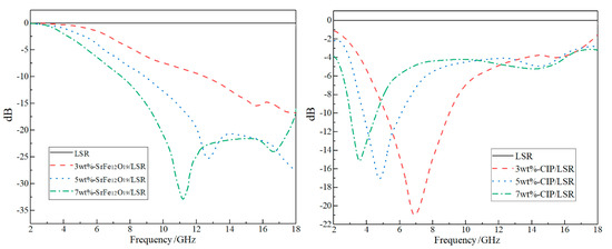 Radar reflectivity frequency spectra and radar absorption characteristics (minimum reflection loss and effective absorption bandwidth) are respectively shown in Figure 7 and Table 1. Absorption peaks of SrFe12O19/LSR nanocomposites are mainly concentrated in high-frequency region, in which the peak position shifts towards a lower frequency from 15.2 to 11.0 GHz when the filling content is raised from 3 wt% to 7 wt%. Meanwhile, both the minimum reflection loss (MRL) and effective absorption bandwidth (fE) of SrFe12O19/LSR can be evidently improved by raising filling content, as indicated in Table 1. In contrast, the absorption peaks of CIP/LSR concentrate in low-frequency region, with both MRL and fE decreasing with the increase of filling content. Meanwhile, the fE values of CIP/LSR are remarkably smaller than those of SrFe12O19/LSR. Furthermore, the peaking point of CIP/LSR shifts towards a lower frequency from 7.0 GHz to 3.7 GHz as the filling content increases from 3 wt% to 7 wt%. In the right columns of Table 1, the radar-absorbing performances of ferrite-ceramic and carbon-based composites from recent reports are also listed in comparison to the present research. It suggests that SrFe12O19/LSR nanocomposites reach the advanced radar absorption performances, and even 7 wt%-SrFe12O19/LSR nanocomposite resides on the top level, as comprehensively evaluated by MRL, fE and absorbing-film thickness.