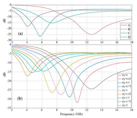 Specifically for C dual-layer with a constant total thickness of 2 mm, the loss layer thickness is set as a variable d1 in the range of 0~2 mm, as shown in Figure 8b. With the increase in loss layer thickness, the minimum reflection loss and the magnitude of the absorption peak increase in the ranges of 1.25~2 mm and 0.25~1 mm, respectively. When CIP/LSR loss layer approaches the thickness of 0.25 mm (SrFe12O19/LSR match layer approaches 1.75 mm thickness), the highest wave absorption performance is acquired by reaching the minimum reflection loss of −33 dB. Whereas, the wave absorption performances of dual layers will be lower than that of single-layers when loss layer is in thicknesses of 1.25~2 mm. Accordingly, it is suggested for designing dual-layer coatings to simultaneously consider the thicknesses of both loss and match layers without fixing the total thickness.