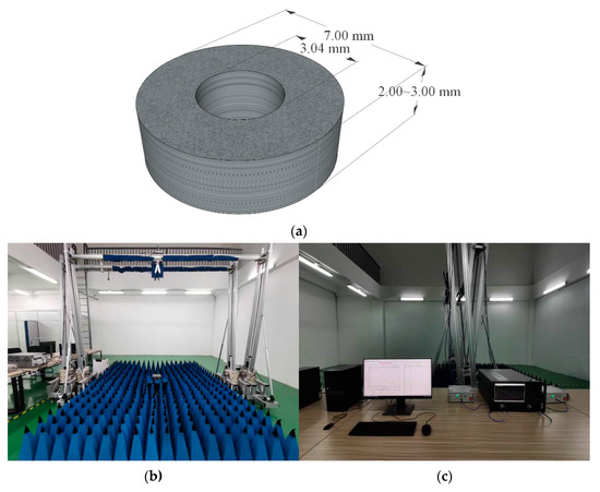 Electromagnetic-response characteristics, which determine the radar-absorbing performances, are tested on the hollow cylindrical specimen of thickness 2~3 mm with a 7 mm outer diameter and 3.04 mm inner diameter (as shown in Figure 9) using a microwave network analyzer (Keysight N5224B, Tekolaire Co. Ltd., Beijing, China) in the frequency range of 2~18 GHz. Radar reflectivity is tested complying with the GJB 2038A-2011 standard, as implemented by the test system shown in Figure 9b,c, in which the film specimen is required in a square shape, with the size being modified according to the testing frequency range, as shown in Table 5.