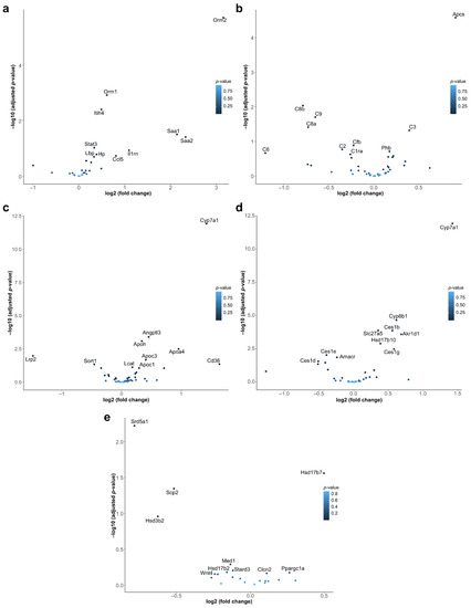 Differential expression of gene sets in Serpina1 KO vs. WT mice. Volcano plots depict the fold-change (x-axis) and significance (y-axis) for genes associated with: (a) acute phase response (n = 38); (b) complement pathway (n = 187); (c) cholesterol metabolism (n = 47); (d) bile acid metabolic processes (n = 44); and (e) steroid hormone biosynthesis (n = 30). The ten most highly significant DEGs in each pathway are annotated.