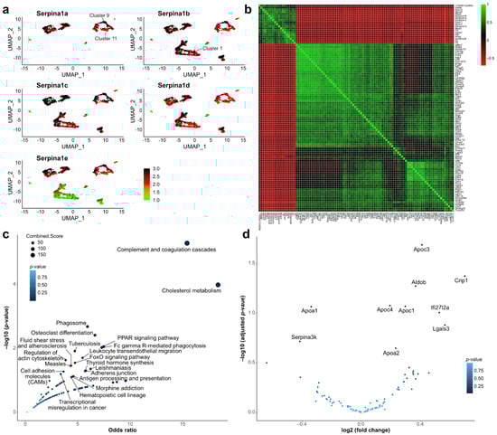 scSEQ data analysis of Serpina1 gene expression. (a): Global expression of Serpina1 isoforms: Serpina1 was broadly expressed in the wild-type mice, with two among thirteen clusters that showed a lower expression. (b): Correlation matrix of Serpina1: Top 100 genes with Serpina1 highly correlated are shown in this plot with highly correlated genes in green and anti-correlated genes in red. (c): Pathway enrichment of correlated genes. (d): Expression changes in the KO dataset of the correlated genes (n = 100). The ten most highly significant DEGs are annotated.