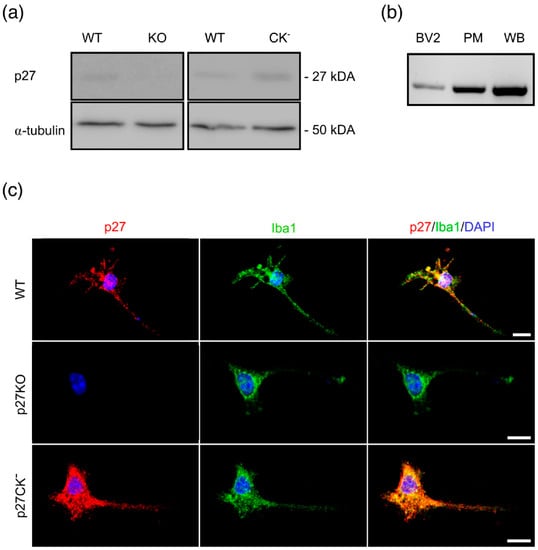 p27 is expressed in microglial cells. (a) Representative Western blots showing the expression of p27 in primary wild type (WT) and p27CK− microglial cells. α-tubulin was used as a loading control. (b) RT-PCR of p27 expression in a murine microglial cell line (BV2 cells), in primary microglial cells (PM), and in a whole brain (WB) extract. (c) Immunofluorescent staining of primary p27WT, p27KO, and p27CK− microglia. Cells were stained with an anti-p27 (red) and an anti-Iba1 (green) antibody and their nuclei were counterstained with DAPI (blue). Scale bar = 10 µm. See also Figure S1.