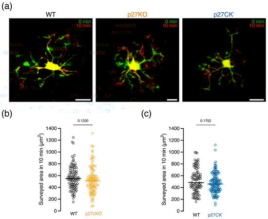 Despite the wide range of properties of p27 in other human and mouse cell types, research on microglia only states a decrease in p27 expression after brain-penetrating injury []. Yet, little is known about the relevance of the protein for microglial dynamics and functions. Here, we explore the role of p27 in microglia using a combination of in vitro and in situ approaches, with a focus on branch motility, migration, and phagocytosis.