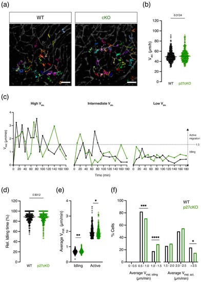 Taken together, our results show that the average microglial migration speed is not altered upon conditional loss of p27. The time spent idling was not affected, but the active migration speed was significantly lower in p27cKO microglia compared to their p27WT counterparts, suggesting a possible migration delay upon loss of p27.