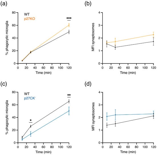 Directed process motility by microglia towards damaged tissue or weak synapses tagged for elimination is often followed by phagocytosis [,,,]. To evaluate whether p27 may influence the phagocytic capacity of microglia, we investigated synaptosome uptake in p27WT, p27KO, and p27CK− microglia. We incubated primary microglia with fluorescently labeled synaptosomes and assessed the percentage of phagocytic microglia at different time points (from 10 min to 2 h) by means of cell fluorescence following synaptosome uptake. In addition, we analyzed fluorescence intensity differences to determine the amount of synaptosome uptake in phagocytic microglia. Loss of p27 increased the percentage of phagocytic microglia after 2 h of incubation (Figure 6a), whereas expression of p27CK− decreased the percentage of phagocytic cells (Figure 6c). Yet, the amount of engulfed synaptosomes, quantified by the median fluorescent intensity (MFI) was not significantly altered among the genotypes (Figure 6b,d).