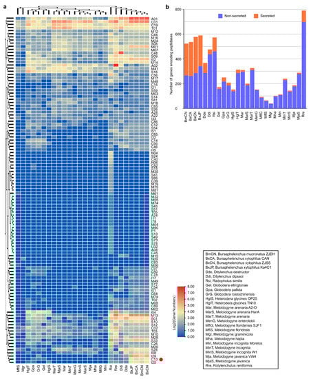 Then, by BLAST searching predicted protein datasets of these PPN genomes against the complete MEROPS peptidase database (https://www.ebi.ac.uk/merops/), peptidases in each genome are identified (Supplementary Table S3). A total of 7861 genes are identified from the 26 PPN genomes, which encode peptidases assigned to 96 families of seven categories (A, C, M, N, P, S, T) according to their catalytic types. Among them, aspartic peptidases (A1), cysteine peptidases (C1, C19), metallo peptidases (M1, M13, M14, M41), serine peptidases (S16), and threonine peptidases (T1), are the abundant groups in the PPN genomes (Figure 1a, Supplementary Table S3). Comparison between migratory and sedentary PPNs shows that genes encoding peptidases in the migratory PPN genomes (371~601, mean 526.29) are much more abundant than those in the sedentary PPN genomes (42~330, mean 188.06), excepting those in the semi-endoparasitic nematode R. reniformis genome, which have 792 genes and 228 of them encode retropepsins (A2A) (Figure 1b, Supplementary Table S3). With software SignalP v4.0 [] (https://services.healthtech.dtu.dk/service.php?SignalP-4.1), a total of 1625 secretory peptidases (20.67% of all peptidases) are predicted from the 26 PPN genomes (Supplementary Table S4). Notably, the percentage of secretory peptidases in the migratory PPNs (35.56% of total peptidases, mean 187.14 members in each) is significantly higher than those in the sedentary endoparasitic PPNs (6.59% of total, mean 12.39 members) and the semi-endoparasitic nematode R. reniformis (11.62%, 92 members) (Figure 1b, Supplementary Table S4). Among secretory peptidases, family A1 and C1 are the most abundant groups. In the four Bursaphelenchus genomes, a total of 578, 592, 538, and 525, peptidase-coding genes are identified from BxCN, BxJP, BxCA, and BmCN, respectively. Among them, genes encoding peptidases in family A1, C13, M1, M13, S10, and S33, are especially abundant in the Bursaphelenchus genomes, compared to other PPN genomes (Figure 1a, Supplementary Table S3). A total of 291 (50.35%), 250 (42.23%), 273 (50.74%), and 257 (48.95%), peptidases are predicted from BxCN, BxJP, BxCA, and BmCN, with signal peptides, respectively, which are putatively secretory peptidases. Notably, the percentages of secretory peptidases in four Bursaphelenchus genomes are significantly abundant in contrast to those in other PPNs (mean 267.75 vs. 25.18), especially peptidases in family A1, C13, M1, M13, S10 (Figure 1b, Supplementary Table S4).