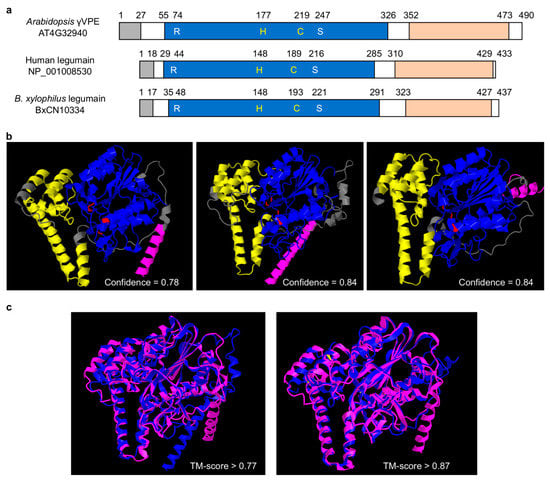 Structural comparison of legumains: (a) primary protein structural organization of B. xylophilus-specific legumain (BxCN10334), Arabidopsis γVPE (AT4G32940), and human AEP (NP_001008530). They have a signal peptide (gray box) at the N-terminus, a peptidase_C13 domain (PF01650) (blue box) and a C-terminal prodomain of legumain (legumain_C, cd2115) (orange box). The C13 domain includes four essential amino acid residues (R, H, C, S), which form the substrate pocket, and the middle two (H, C) are catalytic dyad; (b) prediction of spatial structures of B. xylophilus-specific legumain, Arabidopsis γVPE, and human AEP, with RoseTTAFold online (job IDs 207107, 207108 and 207109, respectively). Pink: signal peptide; blue: peptidase C13 family domain; yellow: C-terminal of prodomain of legumain; red: the essential amino acid residues; (c) protein structure comparison by TM-align, between B. xylophilus legumain and Arabidopsis γVPE, B. xylophilus legumain and human AEP. Pink represent B. xylophilus legumain, blue represent Arabidopsis γVPE or human AEP.