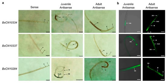 We used both digoxigenin-labelled probes method [] and the fluorescein isothiocyanate method [] to determine tissue expression of the three B. xylophilus-specific legumains (BxCN10334, BxCN10337, and BxCN10284) in the nematode. For digoxigenin-labelled probe hybridization, a fragment of approximately 300 bp was amplified from the coding regions of each gene and used as a template for the synthesis of both DIG-labelled sense and antisense probes (Supplementary Table S12). Hybridization was performed with mixed life stage nematodes. Hybridization signals within the nematodes were detected with alkaline phosphatase-conjugated anti-digoxigenin antibody and substrate and observed under a light microscope (Olympus, Tokyo, Japan). For fluorescence probe hybridization, an approximately 25 bp cDNA fragment specific to each gene was used as an antisense and sense probe, and the 5′- end was labelled with fluorescein isothiocyanate (FITC, Sangon Biotech, Shanghai, China) as previously described with modification []. The hybridization signals were observed under a confocal microscope (Zeiss LSM700, Oberkochen, Germany). Probe sequences are listed in Supplementary Table S12.