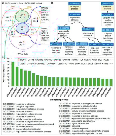 Moreover, we also identify an additional 1333 DEGs displaying similar expression patterns (up- or down regulated) in transcriptomes of the two transgenic lines introduced with BxCN10334 and BxCN10337, including 261 significantly upregulated and 1072 downregulated genes (Figure 7a, Supplementary Table S9). GO enrichment analysis shows that these DEGs are enriched in GO terms response to stimulus (GO:0050896), such as to chemical (GO:0042221), stress (GO:0006950), and hormone (GO:0009725), and terms biological regulation (GO:0065007) and signal transduction (0007165) in category BP (Figure 7c, Supplementary Table S10).
