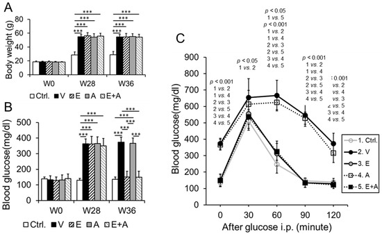 Changes in body weight gain, hyperglycemia and glucose intolerance in diabetic ALDH2*2 mutant mice. Body weight (A), blood glucose (B) and blood glucose tolerance (C) data were shown from non-diabetic control ALDH2*2 mutant mice (Ctrl.), vehicle-treated ALDH2*2 mutant diabetic mice (V), EMP-treated ALDH2*2 mutant diabetic mice (E), Alda-1-treated ALDH2*2 mutant diabetic mice (A) and EMP + Alda-1-treated ALDH2*2 mutant diabetic mice (E + A). Data are presented as mean ± standard error of the mean (SEM). n = 8 of each group. Weeks 0, 28 and 36 were denoted as W0, W28 and W36, respectively. In Figure 1A, *** p < 0.001 vs. Ctrl.; In (B), *** p < 0.001 vs. Ctrl., E and A.