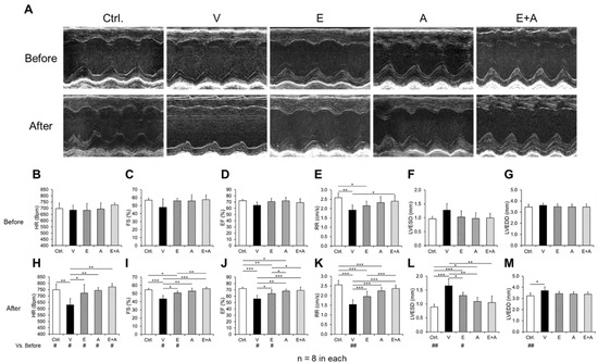 Changes in cardiac functional indices in diabetic ALDH2*2 mutant mice exhibiting HFpEF with vehicle, EMP, Alda-1 and EMP + Alda-1 treatments. The representative ultrasound images of our experimental groups were shown (A). Cardiac functional parameters measured before exercise stress: heart rate (HR) (B), % fractional shortening (FS) (C), % ejection fraction (EF) (D), relaxation rate (RR) data (E), left ventricular end-systolic diameter (LVESD) (F) and left ventricular end-diastolic diameter (LVEDD) (G) were shown from non-diabetic control ALDH2*2 mutant mice (Ctrl.), vehicle-treated ALDH2*2 mutant diabetic mice (V), EMP-treated ALDH2*2 mutant diabetic mice (E), Alda-1 treated ALDH2*2 mutant diabetic mice (A) and EMP and Alda-1 combinedly treated ALDH2*2 mutant diabetic mice (E + A). The cardiac functional parameters changes after exercise stress were shown as below: HR (H), % FS (I), % EF (J), and RR (K), LVESD (L) and LVEDD (M). Data are presented as mean ± standard error of the mean (SEM). n = 8 per group. * p < 0.05, ** p < 0.01 and *** p < 0.001 refer to the difference between individual groups as shown in before and after exercise stress. # p < 0.05 and ## p < 0.01 vs. before exercise stress of that particular group.