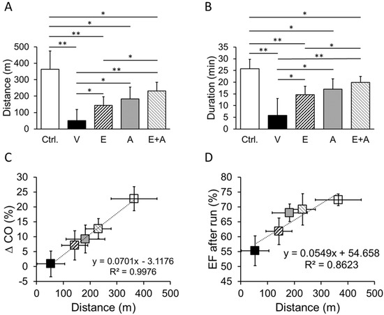 Changes in the running distance with treadmill exercise in diabetic ALDH2*2 mutant mice exhibiting HFpEF with vehicle, EMP, Alda-1 and EMP + Alda-1 treatments. Running distance (A), running duration (B), correlation between by cardiac output with distance (C) and ejection fraction with distance (D) were shown from non-diabetic control ALDH2*2 mutant mice (Ctrl.), vehicle-treated ALDH2*2 mutant diabetic mice (V), EMP-treated ALDH2*2 mutant diabetic mice (E), Alda-1 treated ALDH2*2 mutant diabetic mice (A) and EMP and Alda-1 combinedly treated ALDH2*2 mutant diabetic mice (E + A). Data are presented as mean ± standard error of the mean (SEM). n = 8. * p < 0.05 and ** p < 0.01 refer to the difference between individual groups as shown.